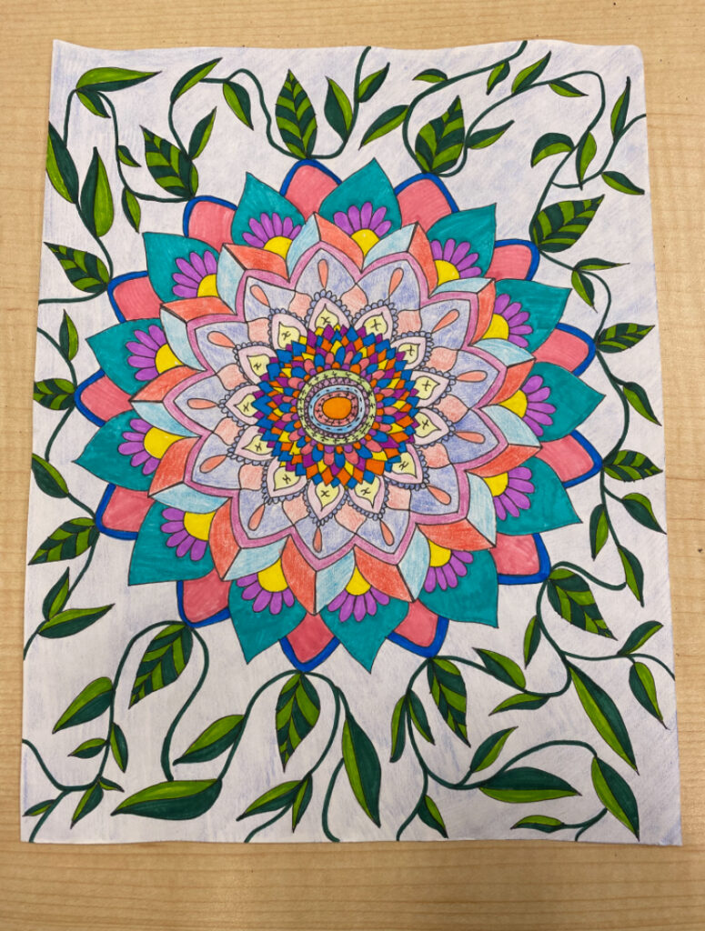 This is one of the assignments that we did in the class called a “Math Mandala”. The mandala represents my own personal math journey. The colors in the center are bright and exciting with concepts such as addition and subtraction on the leaves. As the mandala spreads the colors grow dim as did my interest in math after elementary school. At the tip of this mandala is leaves, which represent my math journey in the education program. They are meant to show growing from the past math experiences and continuing to branch into different areas of my own life.