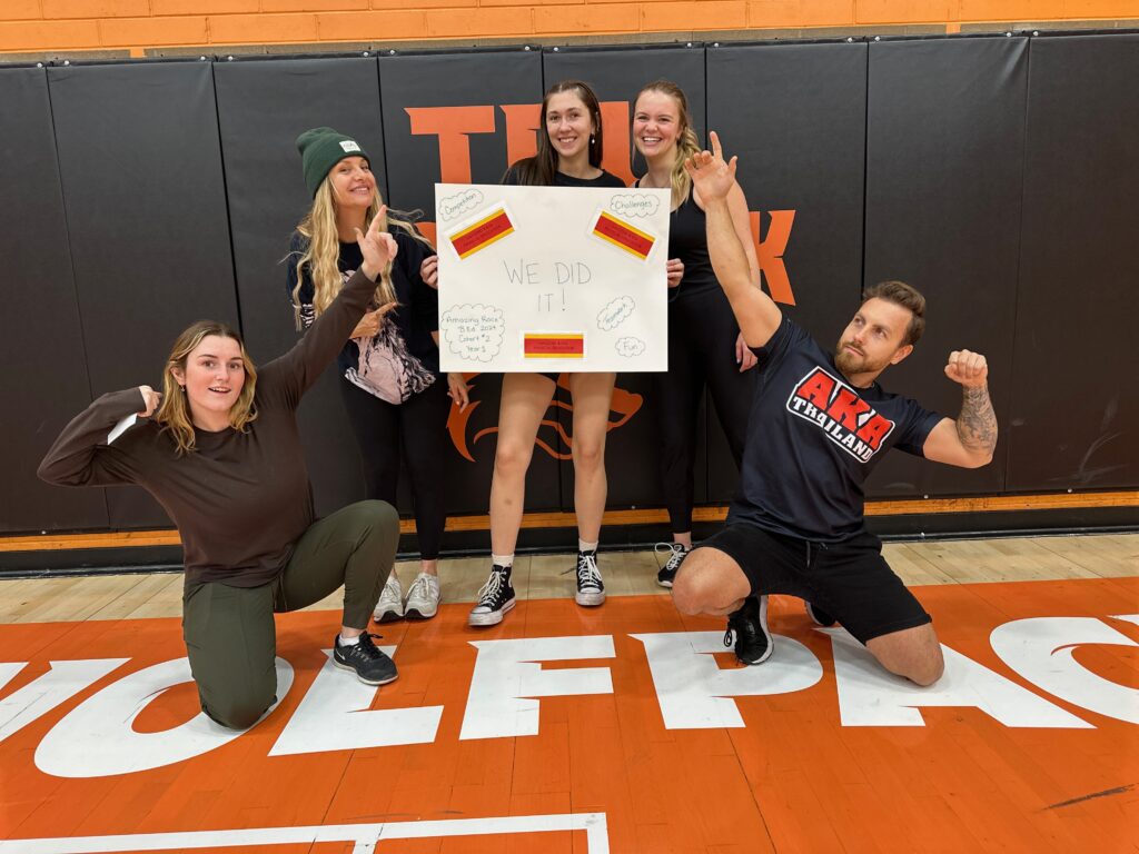This is a photo of my Amazing Race team in EDPE 3100 after we worked together to win the race!