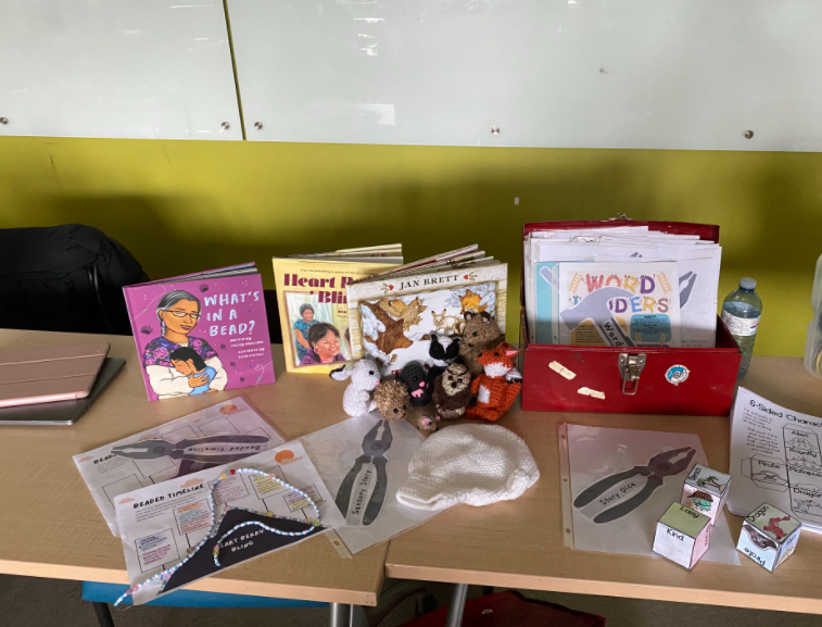 This is a photo of my personal toolbox display. Featured are my Indigenous inspired “beaded plot profile” lesson resource, my handmade sensory story that I crocheted to pair with the book “The Mitten” by Jan Brett and a toolbox full of 28 other resources.